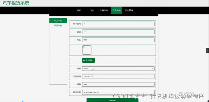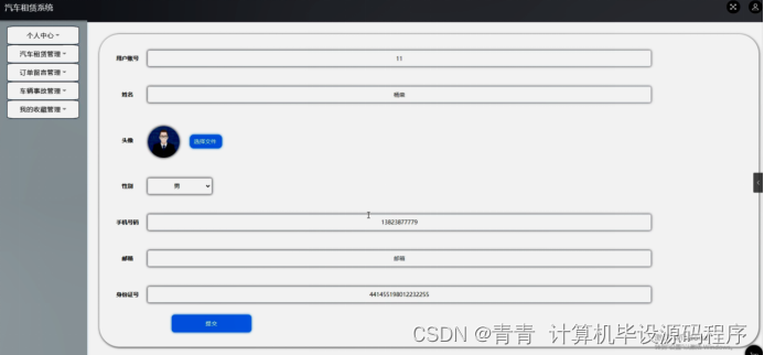 个人中心,在个人信息页面通过填写用户账号,姓名,头像,性别,手机号码,邮箱,身份证号等内容并提交进行个人信息修改操作,如图5-21所示。