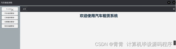 用户登录进入系统可以对主页,个人中心,汽车租赁管理,订单留言管理,车辆事故管理,我的收藏管理等功能进行详细操作,如图5-20所示。