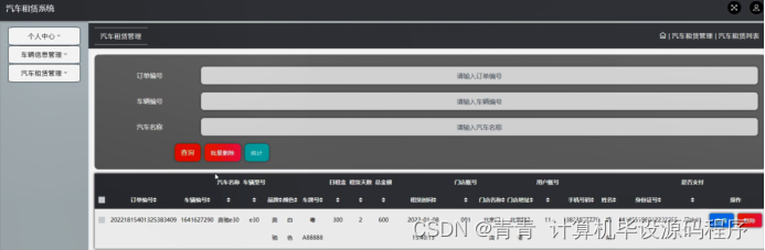 汽车租赁管理,在汽车租赁管理页面可以对订单编号,车辆编号,汽车名称,车辆型号,品牌,颜色,车牌号,日租金,租赁天数,总金额,租赁时间,门店账号,门店名称,门店地址,用户账号,手机号码,姓名,身份证号,是否支付等内容进行查看或删除等操作,如图5-19所示。