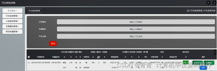汽车租赁管理,在汽车租赁管理页面可以对订单编号,车辆编号,汽车名称,车辆型号,品牌,颜色,车牌号,日租金,租赁天数,总金额,租赁时间,门店账号,门店名称,门店地址,用户账号,手机号码,姓名,身份证号,是否支付等内容进行留言评价,车辆事故或查看等操作,如图5-22所示。