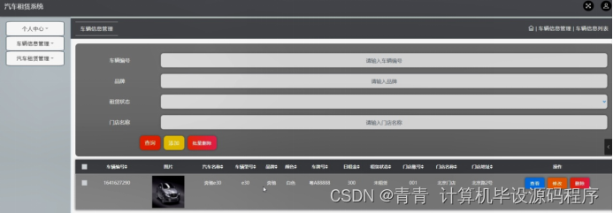 车辆信息管理,在车辆信息管理页面可以对车辆编号,图片,汽车名称,车辆型号,品牌,颜色,车牌号,日租金,租赁状态,门店账号,门店名称,门店地址等内容进行查看,修改和删除等操作,如图5-10所示。