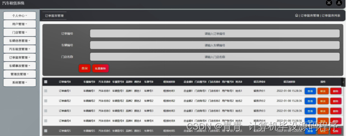 订单留言管理,在订单留言管理页面可以对订单编号,车辆编号,汽车名称,车辆型号,品牌,颜色,车牌号,租赁时间,总金额,门店账号,门店名称,用户账号,姓名,留言评价,留言时间等内容进行查看,修改和删除等操作,如图5-12所示。