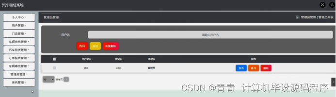 该部分内容包含了主页,个人中心,用户管理,门店管理,车辆信息管理,汽车租赁管理,订单留言管理,车辆事故管理,管理员管理,系统管理等功能。管理员可对所有的信息进行增、删、改、查,能对用户信息进行管理,更新最近的汽车租赁信息。