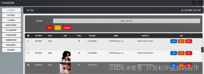 用户管理,在用户管理页面可以对用户账号,姓名,头像,性别,手机号码,邮箱,身份证号等内容进行查看,修改和删除等操作,如图5-8所示。