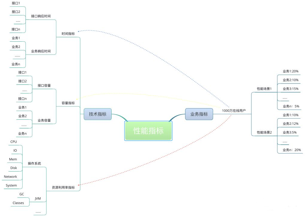 在一个具体的业务场景中,性能场景中的业务模型和二八原则并没有什么关系,即使从宏观上来说有关系,也是很牵强的,至少至今为止,还没看到任何有数据和数学公式的支撑证明。常识的适用情况在于通用,但实际场景中经常会有各种“意外”。以12306购票系统为例,以前春运抢票时经常会有朋友、家人吐槽12306好卡、好慢,估计之前业务模型用了28原则(人们习惯拿这个经济学定律移花接木到各个领域,二八定律是19世纪末20世纪初意大利经济学家帕累托发现的,帕累托从大量具体的事实中发现:社会上20%的人占有80%的社会财富),虽然已经进行过了压力测试、疲劳测试,但还是抵挡不住全国人民着急回家的心情,拼命的发送请求......所以实际情况要实际考虑,以通用估意外肯定会很多坑,只有不断地优化,更新才能一步步满足用户地需要。(PS:现在12306系统已经好很多了)。业务指标和性能指标之间的关系是这样的: