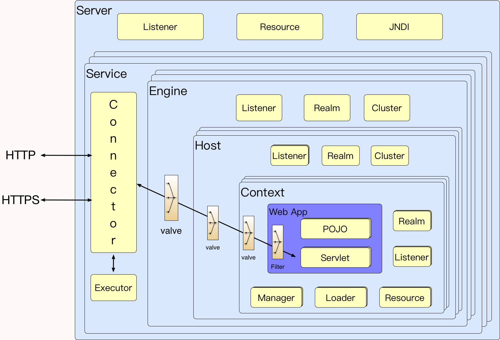 在当今 Spring Cloud 微服务架构盛行的时代,Tomcat 仍然作为应用最广的应用服务器而存在着,所以我们不得不说一说对它的性能分析。很多时候,我们做性能测试分析时,都会把 Tomcat 这类的应用弄混淆。对它的监控和分析,总是会和 JDK、框架代码、业务代码混合来看,这就导致了分析上的混乱。我们应该把这些分析内容分隔开来,哪些是 tomcat,哪些是 JDK 等。在我看来,Tomcat、WebLogic、WebSphere、JBoss 等,它们都具有同样的分析思路。因为 Tomcat 的市场范围更大,所以,今天,我们以它为例来说明这类应用应该如何分析。首先我们得知道它的架构: