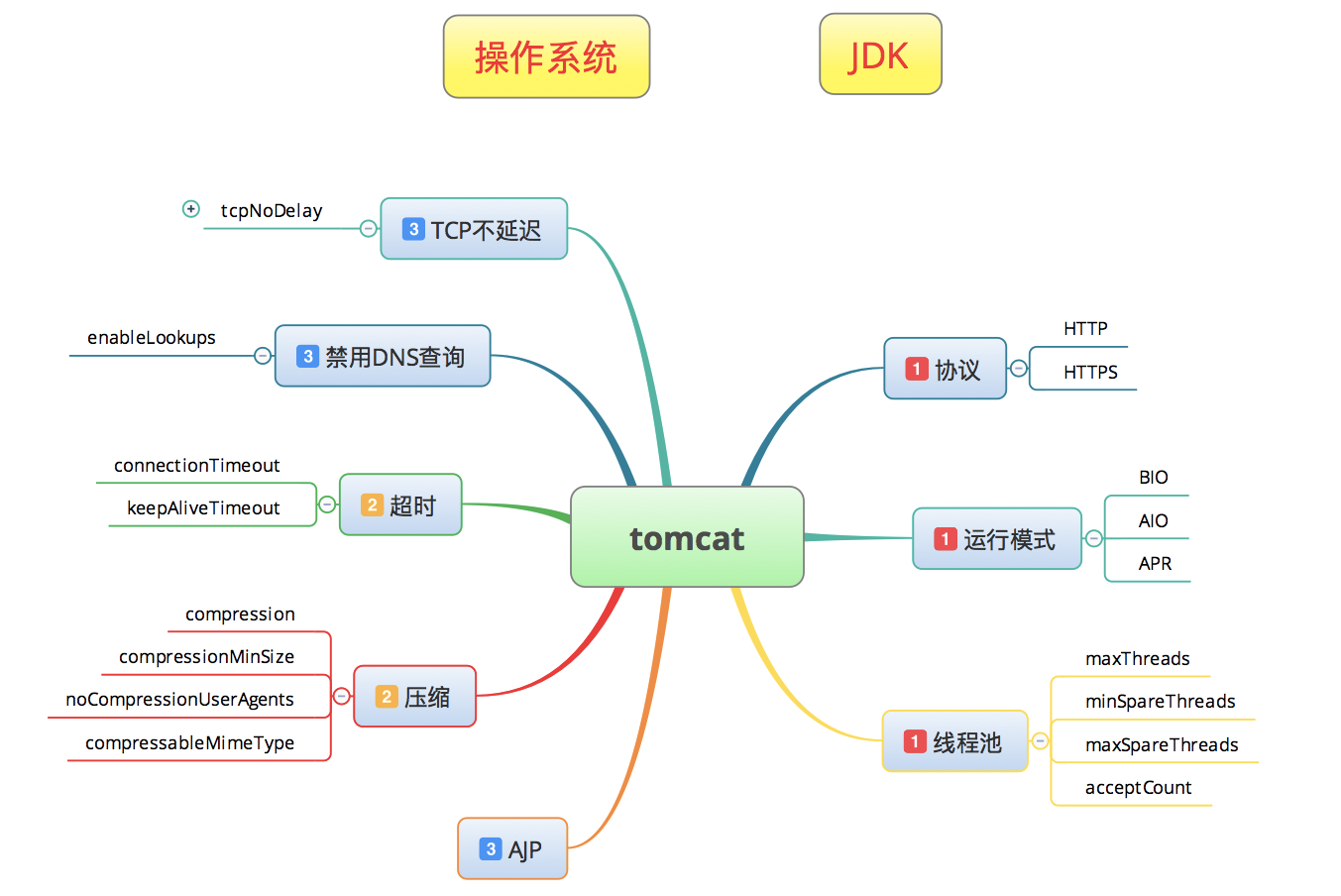 基本从以下几个方面的计数器来分析优化Tomcat(以及类似tomcat的应用服务器):协议(http,https),运行模式(BIO,AIO,APR),线程池(maxThreads、acceptCount);超时时间,压缩,TCP不延迟,禁用DNS查询,禁用AJP连接器。