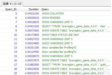 show profiles;此命令展示最近执行的sql语句,默认是15次,如下: