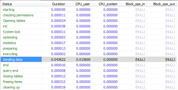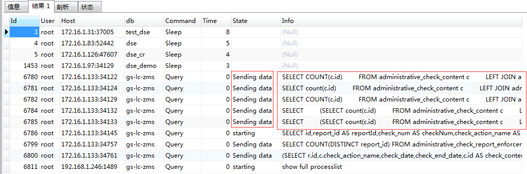 上图的SQL执行具体细节,左边Status列展示了一条SQL执行的从开始到清理的整个生命周期中执行的操作。如果在其生命周期阶段出现如下的情况的就要重视了: