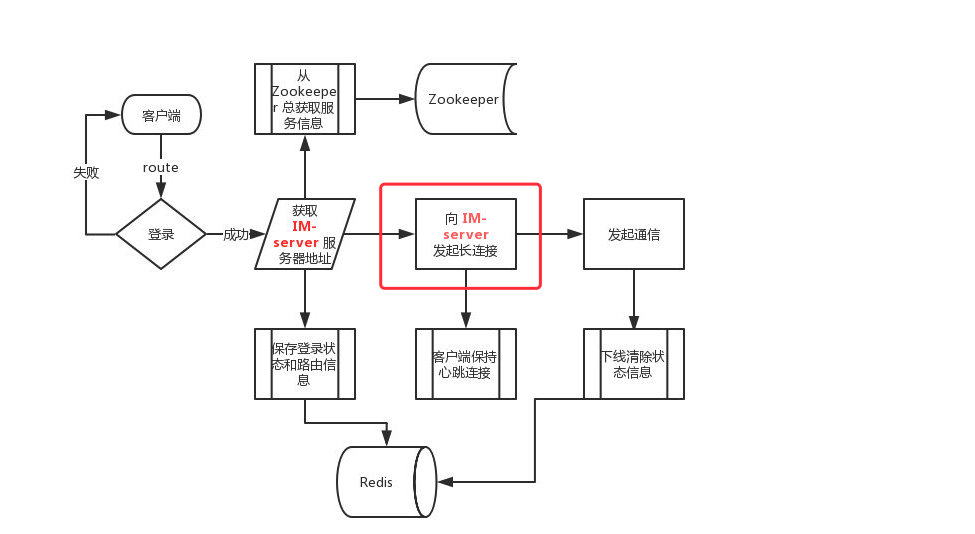 Zookeeper中选择可用IM-server返回给客户端,并保存登录、路由信息到Redis。 - 客户端向