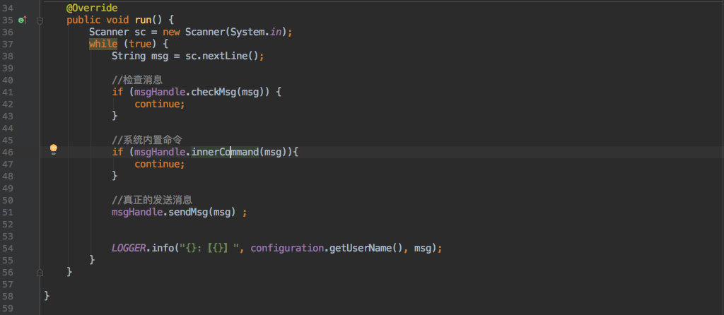 由于我自己不怎么会写界面,但保不准有其他大牛会写。所以客户端中的群聊、私聊、获取在线用户、消息回调等业务(以及之后的业务)都是以接口形式提供。