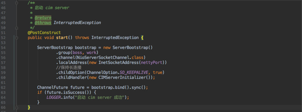 由于是在 SpringBoot 中搭建的,所以在应用启动时需要启动 Netty 服务。