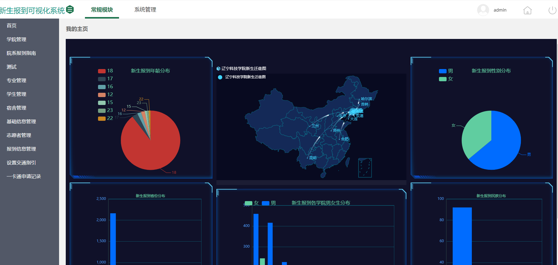 在这个数字化的时代里,随着高校招生规模的不断扩大,招生后期的数据处理与迎新工作变得更加繁重,各高校普遍希望将信息技术引入到迎新工作中,加强参加迎新的各个部处间的信息流通和工作配合,使迎接新生的工作流程更为有序,提高学校各相关部门工作效率。在这样的背景下,新生入学报到管理系统应运而生,并成为高校数字化校园的一个组成部分。该工作涉及到学生处、教务处、后勤、各学院等诸多部门。这一工作的执行情况一定程度可以反映学校的管理水平和效率。过去,新生报到以及随后的学籍档案等工作都需要手工完成,因此其工作效率及数据准确度都存在很大问题,很容易造成新生报到时的混乱场面,增加了由于人工登记而带来的资金、人力、物力的消耗。用计算机来管理新生报到可以避免不必要的资源浪费。针对新生的报道情况进行分配,避免所分配的学号、床位号出现空缺的现象,也节省了教务处人员的工作强度,避免了提前去做新生的相关分配工作。新生报到数据可视化分析系统可以很好地解决这个问题,是一个教育单位不可或缺的部分。