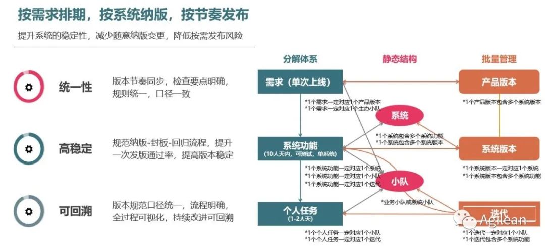 需要注意的是,其实不存在唯一的拆分方式,只要拆出来的系统功能,测试有黑盒办法验收就可以。让全行接受系统功能拆分,Agilean 团队初步花了3个月的时间,不过,这个习惯也需要后续不断夯实坚持。拆分的核心目标,就是可以通过通过测试的系统功能数量来客观反应需求进展,来反应小队产能。