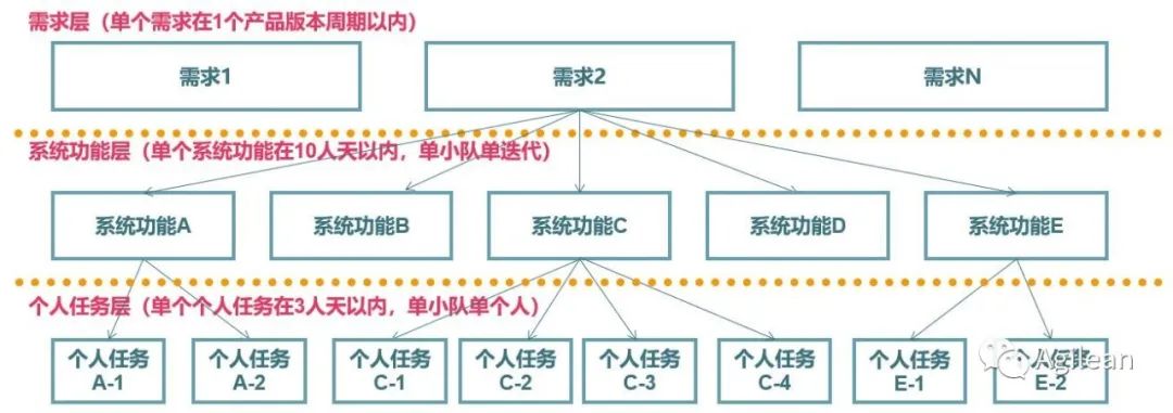 为了解决这个问题,让研发组织的精细化管理成为可能。首先需要从方法论上,统一思想,统一度量衡。明确全行是如何把业务需求,逐层分解到个人。为此,我们引入三层需求任务分解体系:「业务需求-系统功能-个人任务」。