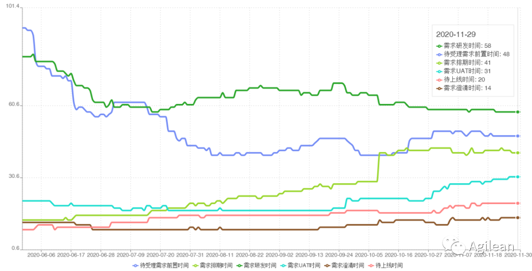 需求分段时效:用于展示需求在各阶段的耗时,如需求分析、设计、研发、测试、验收等各状态分别停留时长。通过需求分段时效可以分析耗时较长的阶段,具体改进此阶段的流程,持续观察变化趋势。
