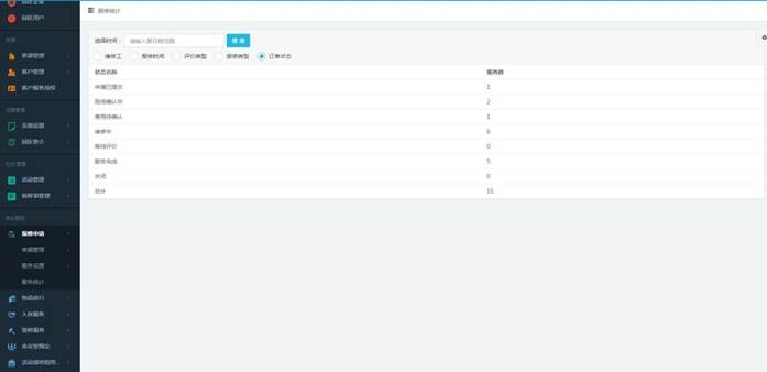 - 订单统计:服务订单的统计分析及用户角色、权限的配置及管理。