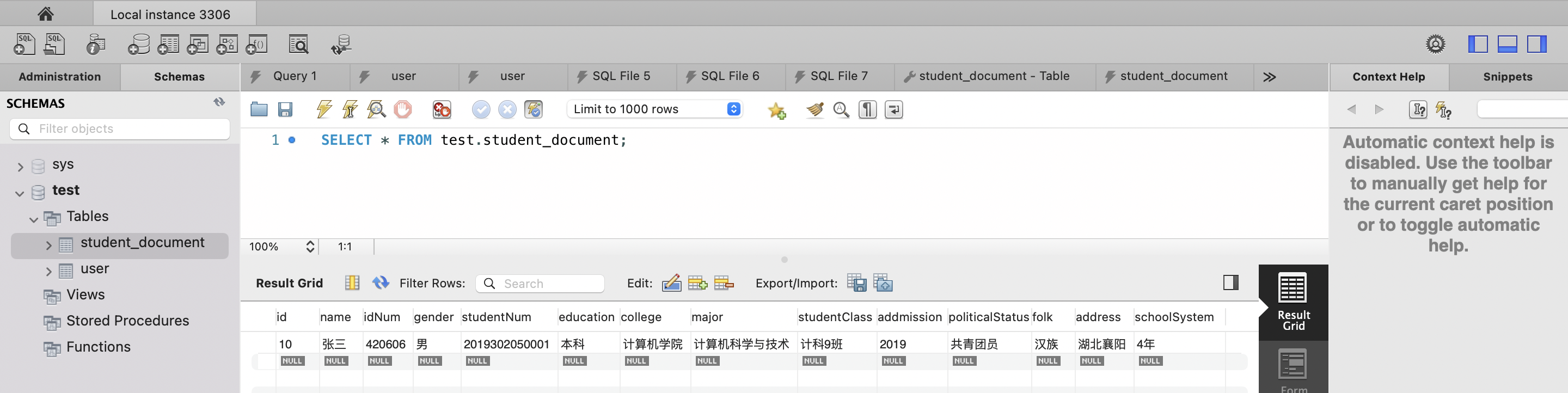 这里的查询功能通过Spring MVC整合Spring后,调用了studentDoucmentService接口,然后再通过Spring整合Mybatis,调用StudentDocumentDao接口,实现数据库查询,具体实现如下: