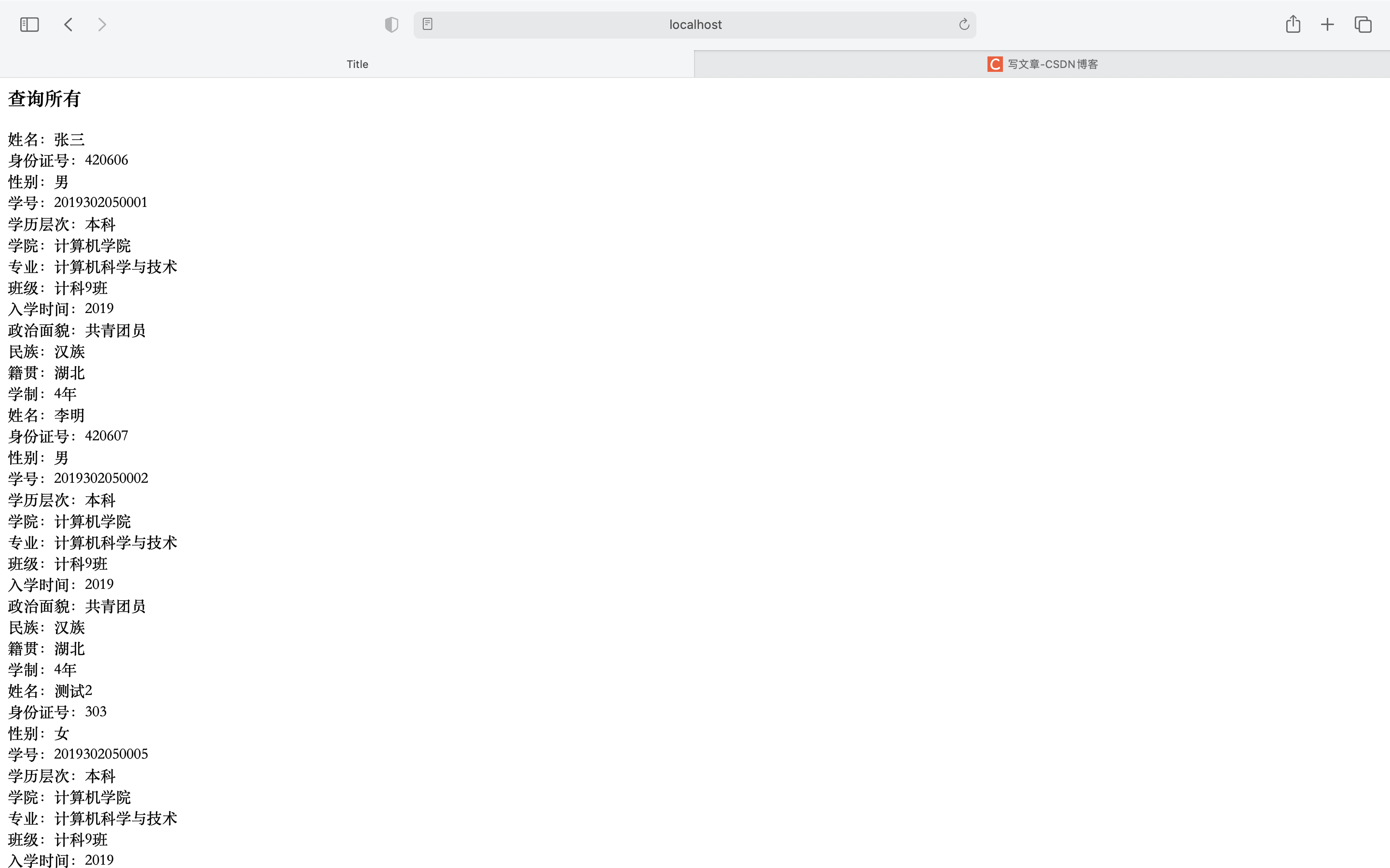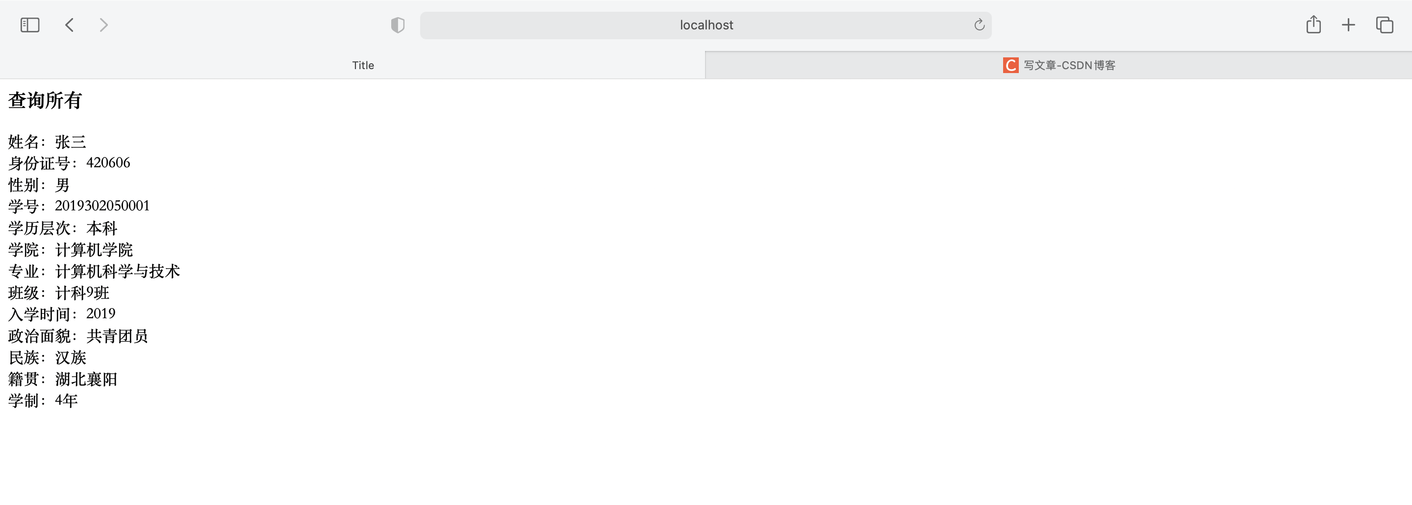 点击index.jsp中查询所有学籍信息的超链接,在list.jsp中确实返回了所有的信息。