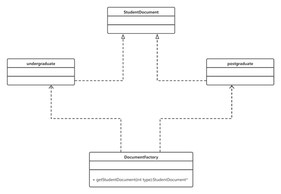 定义DocumentFactory类,封装getStudentDocument方法,根据传入的参数不同创建、返回不同的具体产品类的对象,当参数为1,创建并返回undergraduate类对象,当参数为2,创建并返回postgraduate类对象。工厂类定义代码如下: