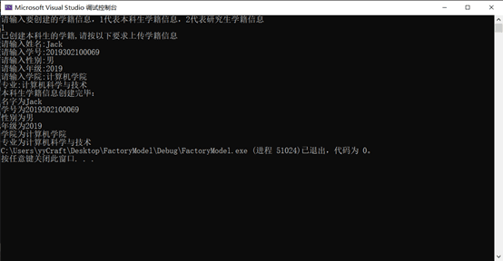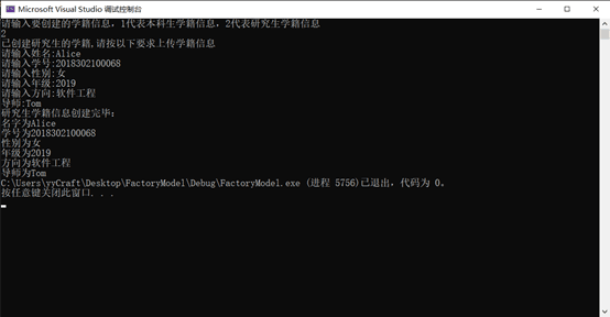 main.cpp代码如下,其中根据用户输入的数字创建具体产品类的对象,然后调用产品类的方法对学籍信息进行设置。