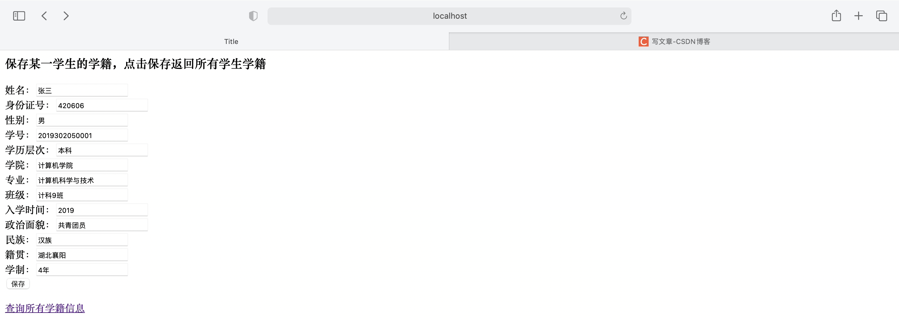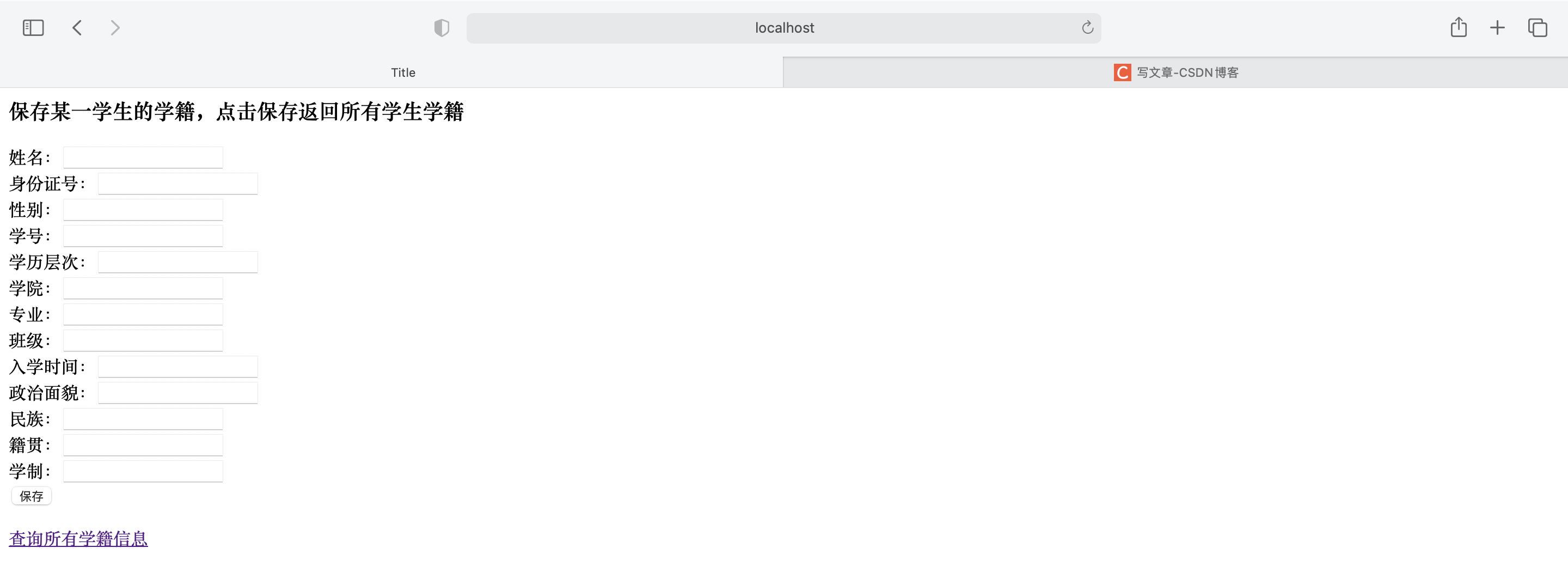 这里的用户操作界面(index.jsp)提供查询所有学籍的超链接和一个录入学籍的表单,供用户进行查询和录入的功能,其界面如下: