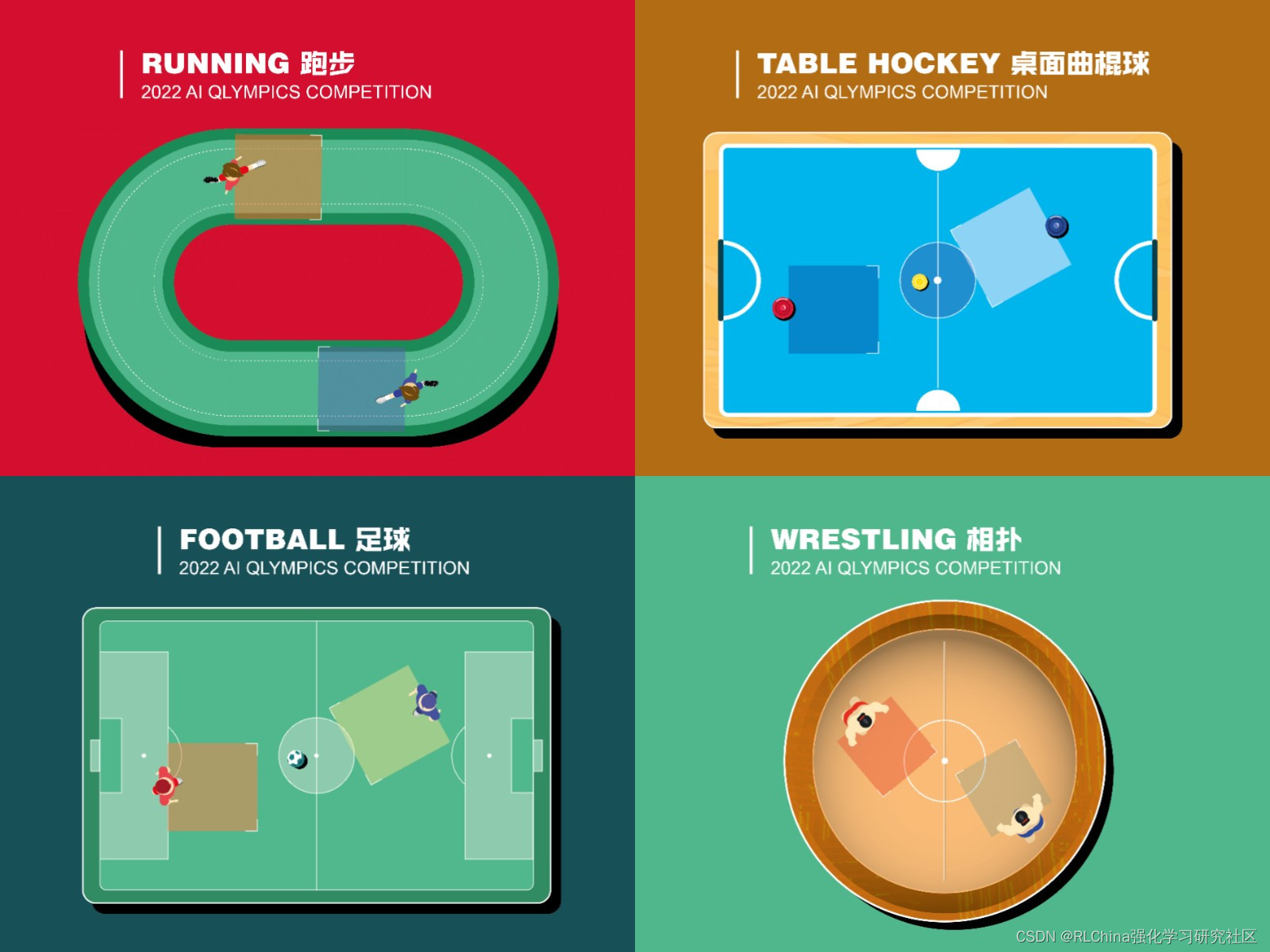 “AI奥林匹克竞赛”打造了丰富有趣的竞赛环境,包含足球、跑步、桌面曲棍球、相扑等项目,将在不同的环境中对参赛智能体进行测试,充分考察智能体泛化性,与广大参赛者一道推动通用决策智能体的研究。