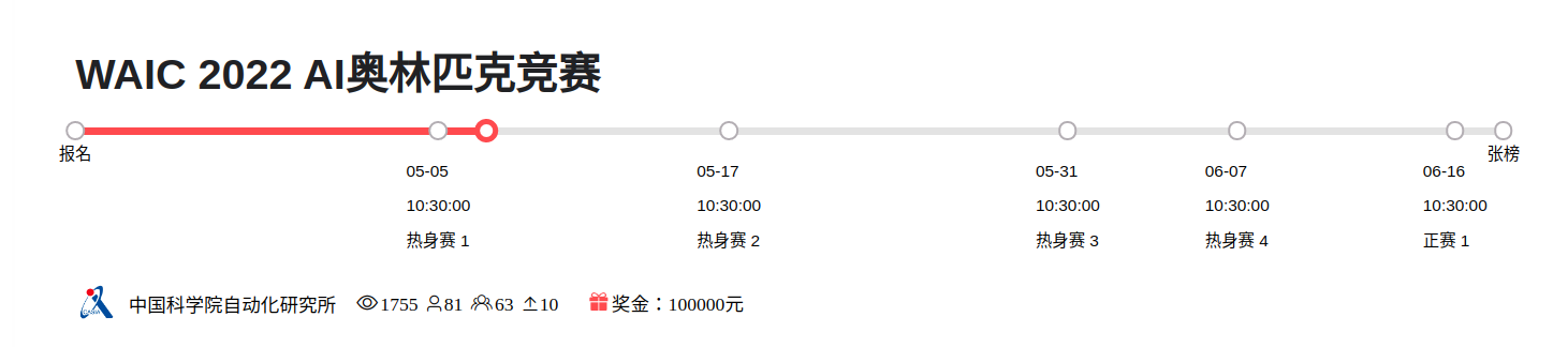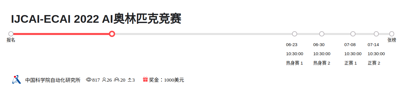 第一阶段的比赛将作为2022年世界人工智能大会(WAIC 2022)的一部分。由中国科学院自动化研究所主办,上海数字大脑科技研究院、北京大学人工智能研究院、上海交通大学APEX数据和知识管理实验室、上海伯禹教育科技有限公司和RLChina强化学习社区协办。
