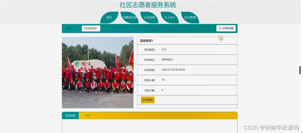 志愿者活动,在志愿者活动页面可以查看活动名称、活动类型、活动图片、活动地点、活动时间、活动人数、点击次数、活动内容等内容,并进行在线报名,评论和收藏等操作,如图5-3所示。