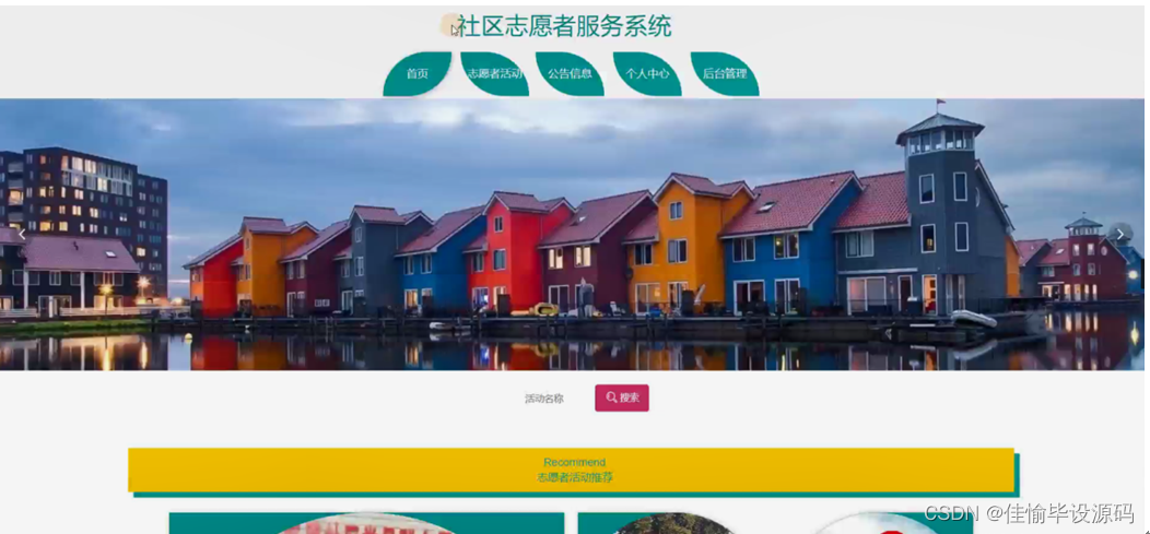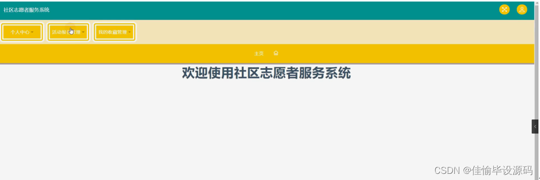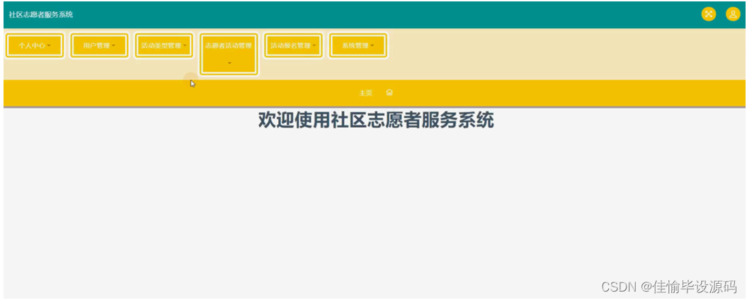 社区志愿者服务系统,在系统首页可以查看首页、志愿者活动、公告信息、个人中心、后台管理等内容,并进行详细操作;如图5-1所示。