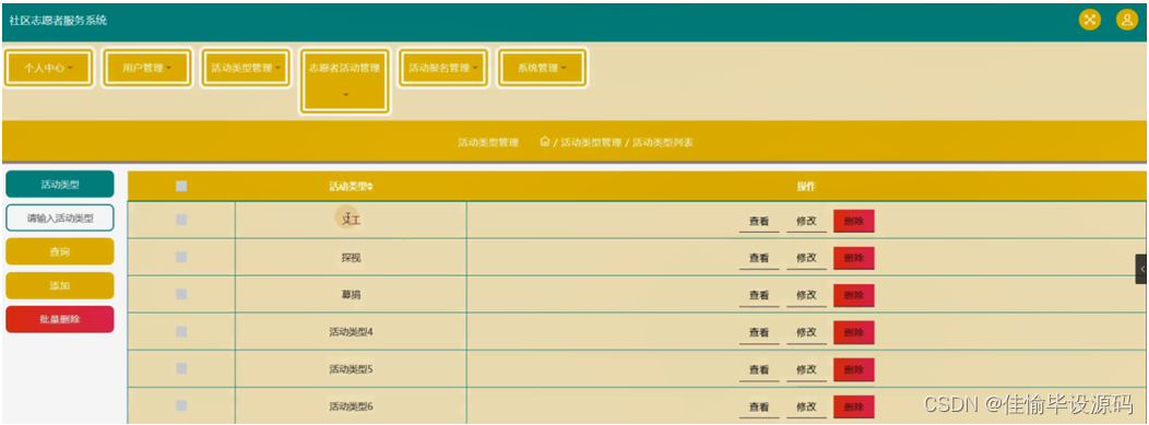 活动类型管理,在活动类型管理页面可以对活动类型信息进行查看,修改和删除等操作,如图5-8所示。