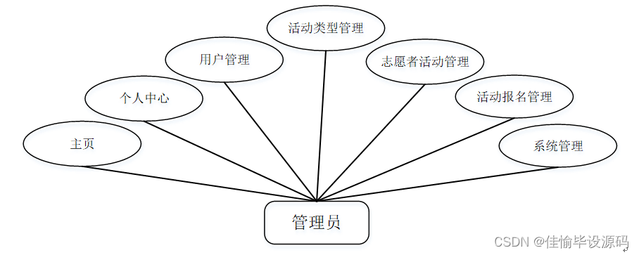 管理员登陆后,主要模块包括主页、个人中心、用户管理、活动类型管理、志愿者活动管理、活动报名管理、系统管理等功能。管理员用例图如图3-1所示。