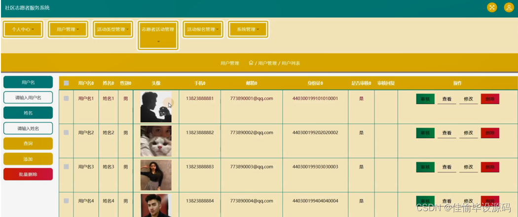 用户管理,在用户管理页面可以对用户名、姓名、性别、头像、手机、邮箱、身份证、是否审核、审核回复等内容进行审核,查看,修改和删除等操作,如图5-7所示。
