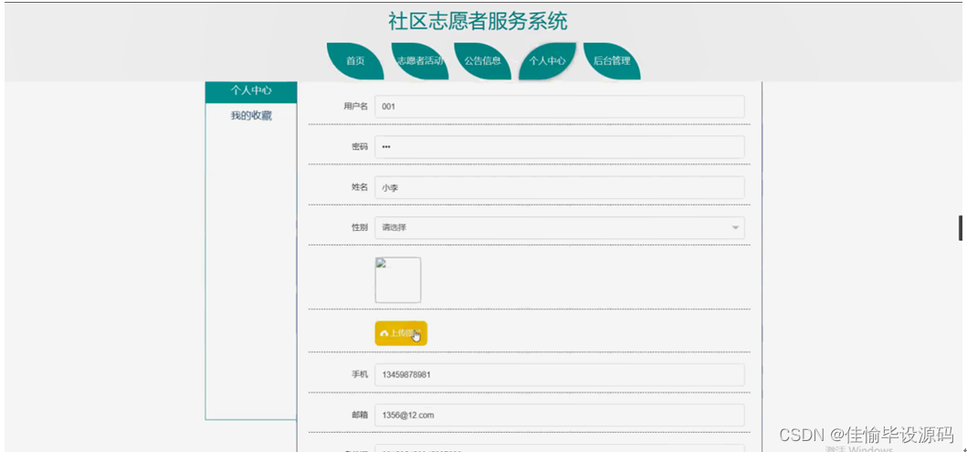 用户登录进入系统后台可以对主页、个人中心、活动报名管理、我的收藏管理等功能进行相应操作,如图5-12所示。