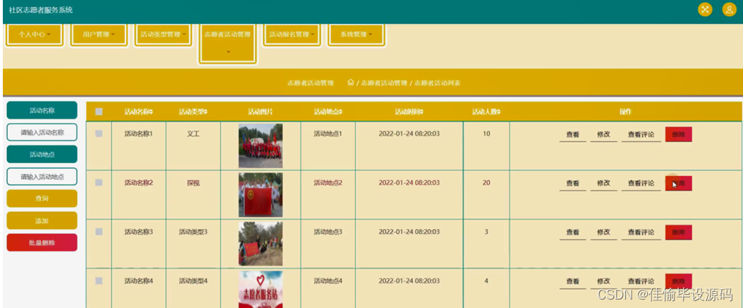 志愿者活动管理,在志愿者活动管理页面可以对活动名称、活动类型、活动图片、活动地点、活动时间、活动人数等内容进行查看、修改、查看评论和删除操作,如图5-9所示。