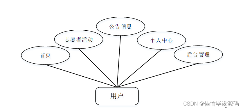 用户进入页面可以实现首页、志愿者活动、公告信息、个人中心、后台管理等;用户用例图如图3-2所示。