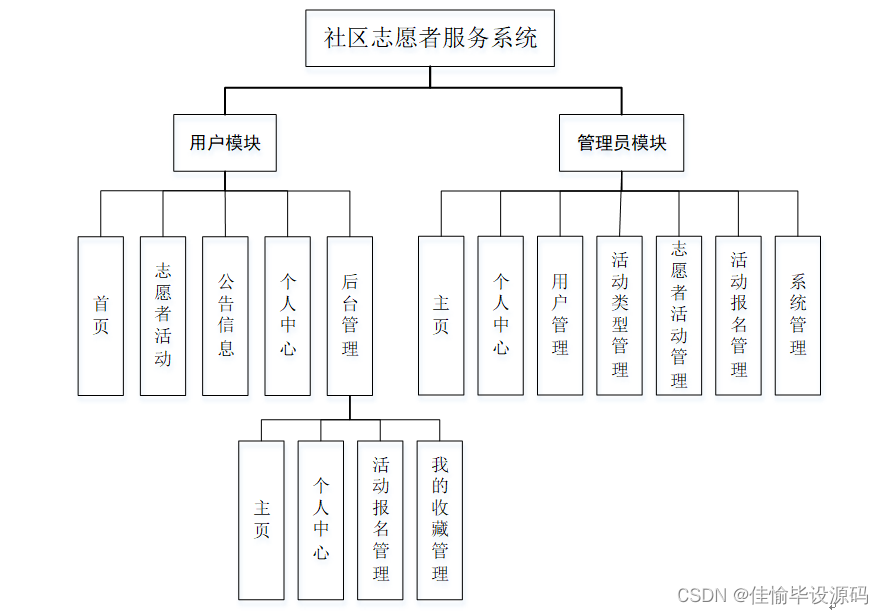 为了更好的去理清本系统整体思路,对该系统以结构图的形式表达出来,设计实现该社区志愿者服务系统的功能结构图如下所示: