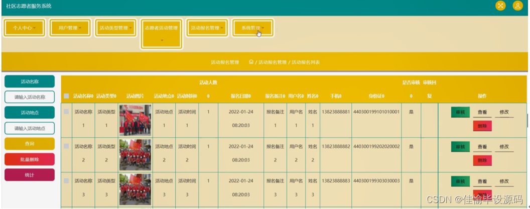 活动报名管理,在活动报名管理页面可以对活动名称、活动类型、活动图片、活动地点、活动时间、活动人数、报名日期、报名备注、用户名、姓名、手机、身份证、是否审核、审核回复等内容进行审核,查看,修改和删除操作,如图5-10所示。