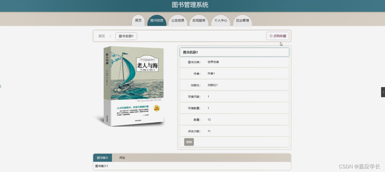 图书信息,在图书信息页面可以查看图书名称、图书分类、作者、出版社、封面、可借天数、可借数量、数量、点击次数、图书简介等内容,并进行借阅,评论或收藏等操作,如图5-3所示。