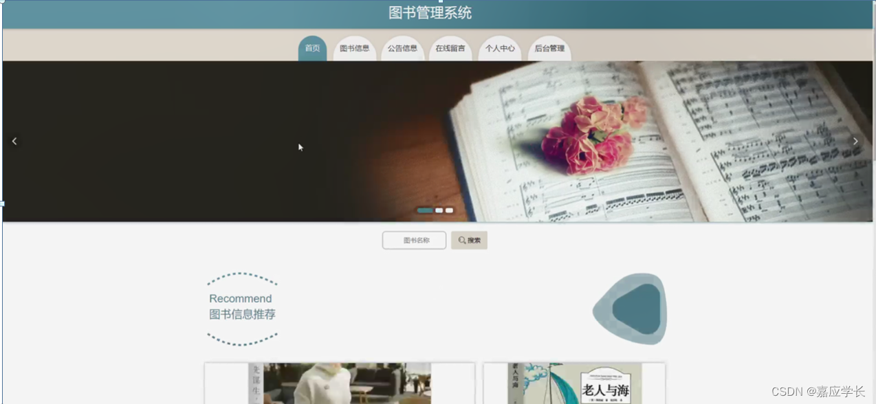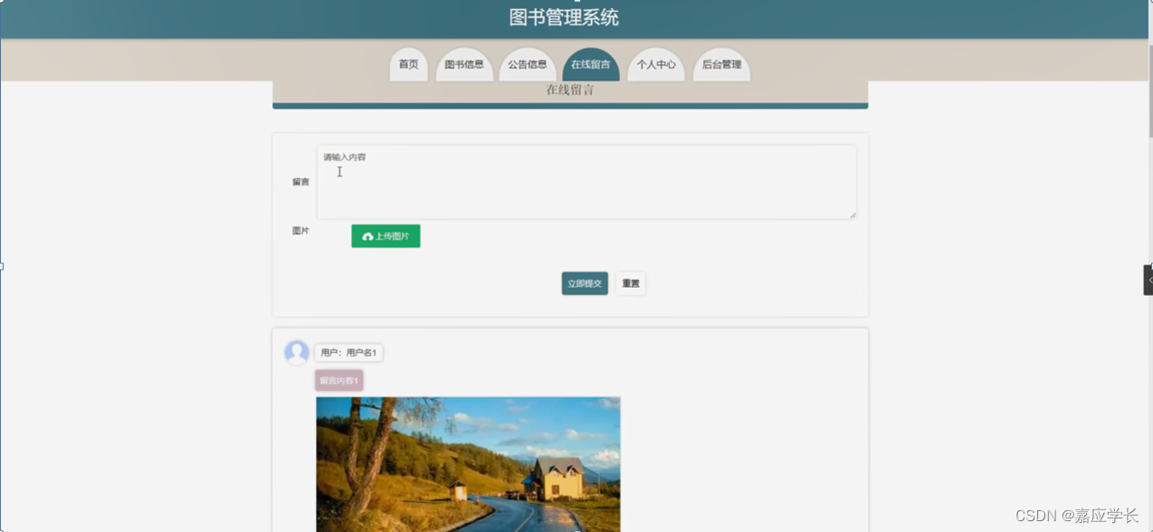 图书管理系统,在系统首页可以查看首页、图书信息、公告信息、在线留言、个人中心、后台管理等内容,并进行详细操作;如图5-1所示。