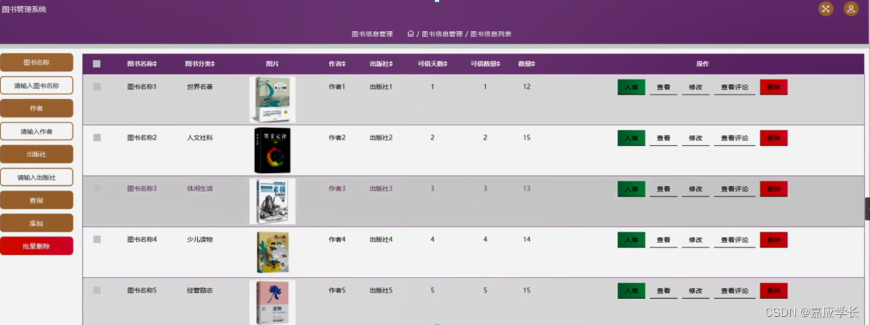 图书信息管理,在图书信息管理页面可以对图书名称、图书分类、图片、作者、出版社、可借天数、可借数量、数量等信息进行入库,查看,修改,查看评论或删除等操作,如图5-9所示。