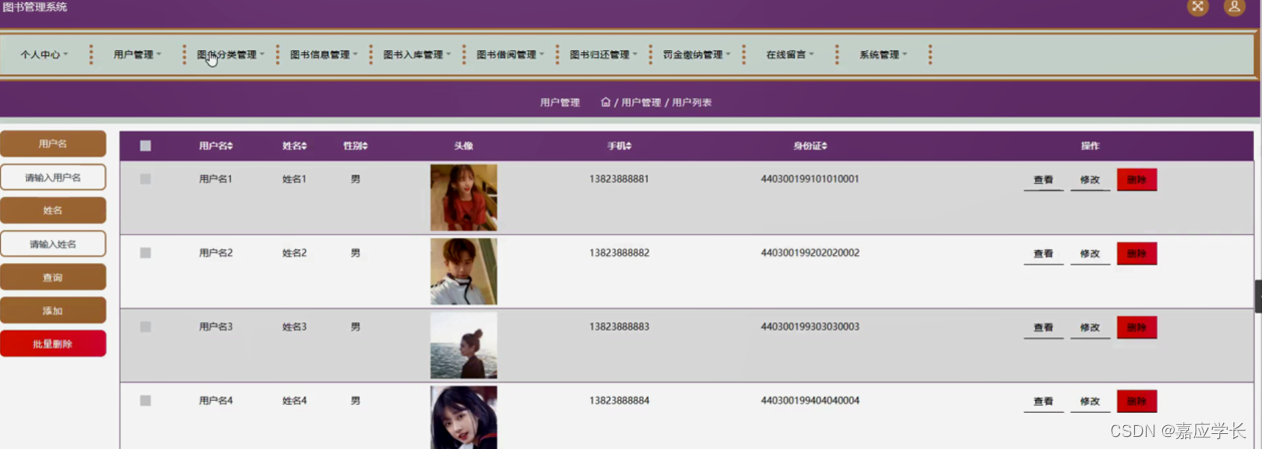 用户管理,在用户管理页面可以对用户名、姓名、性别、头像、手机、身份证等内容进行查看,修改和删除等操作,如图5-8所示。