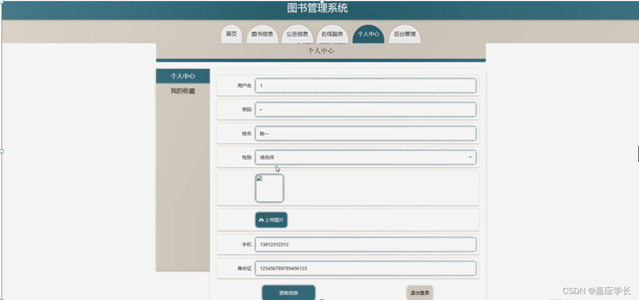 个人中心,在个人中心页面通过填写用户名、密码、姓名、性别、上传图片、手机、身份证等信息进行更新信息,还可以根据需要对我的收藏进行详细操作,如图5-5所示。