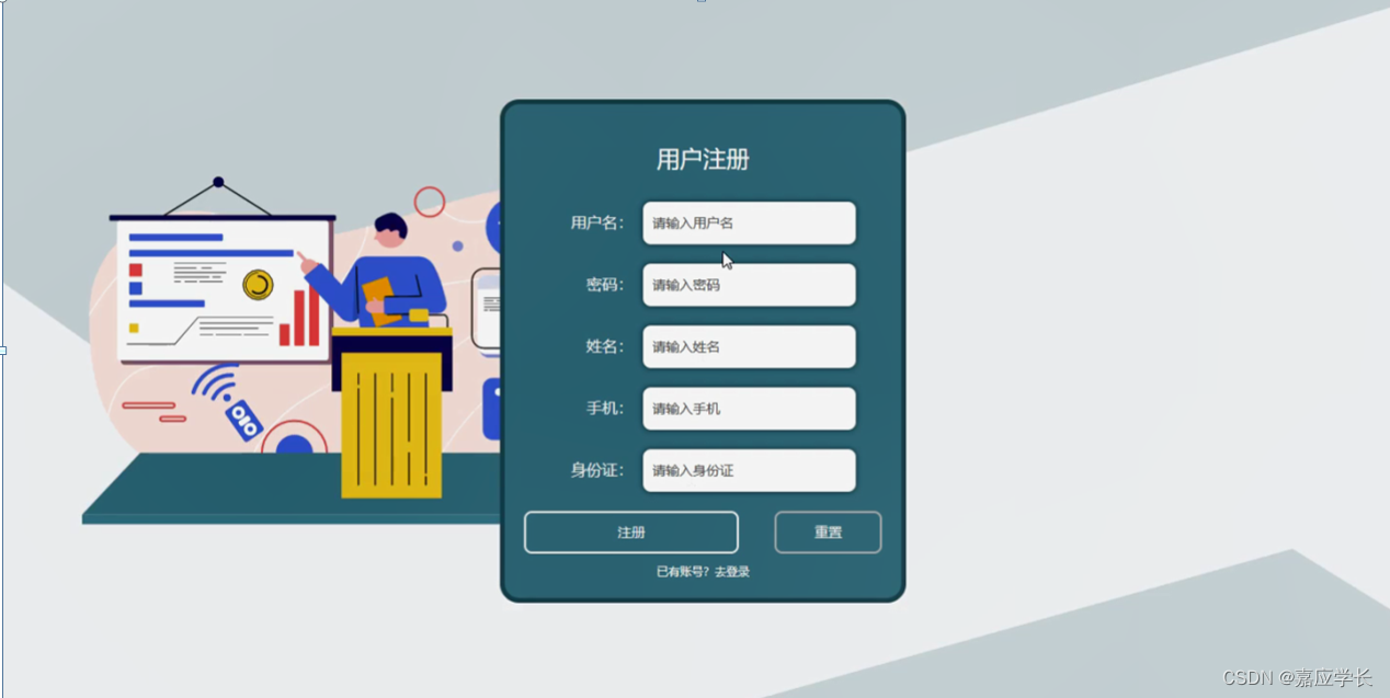用户注册,在用户注册页面通过填写用户名、密码、姓名、手机、身份证等信息进行注册操作,如图5-2所示。