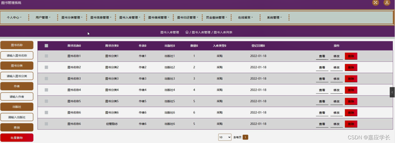 图书入库管理,在图书入库管理页面可以对图书名称、图书分类、作者、出版社、数量、入库类型、登记日期等内容进行查看、修改或删除等操作,如图5-10所示。