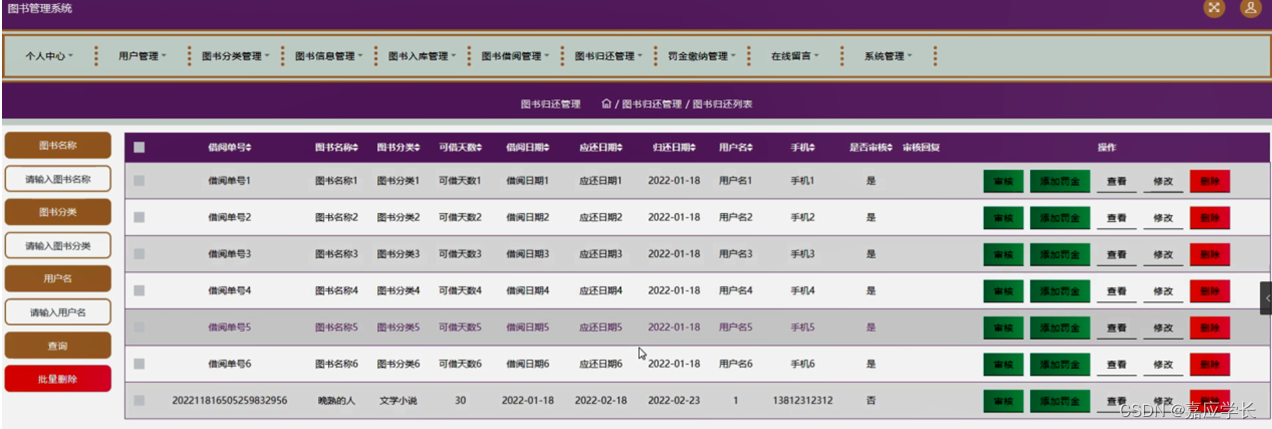 图书归还管理,在图书归还管理页面可以对借阅单号、图书名称、图书分类、可借天数、借阅日期、应还日期、归还日期、用户名、手机、是否审核、审核回复等内容进行审核,添加罚金,查看,修改或删除等操作,如图5-12所示。