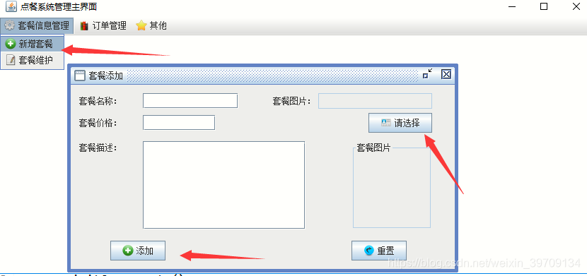 管理员点击新增套餐信息、录入相关信息、选择图片等完成添加