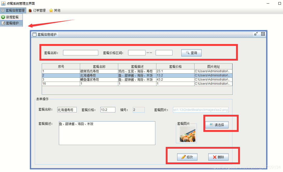 管理员进入套餐维护页面、可以根据套餐名称和价格区间等数据进行模糊查询数据、选择套餐信息可以修改或删除套餐