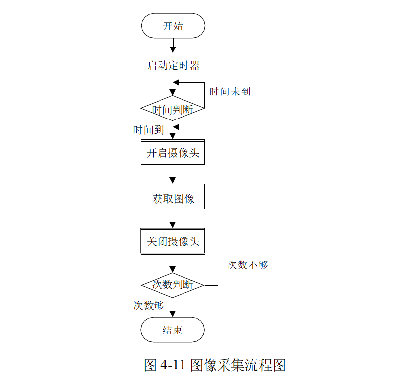 图像采集是考勤系统的核心模块之一,完成图像的定时和定次抓拍功能,流程如图 4-11 所示,这个模块主要涉及到摄像头控制、定时器触发以及图片获取等步骤。定时器启动前,预先设置定时时间和采集次数。系统通过持续监听定时器来触发定时任务,当设定时间到时,执行一次图像获取指令,并且在图像获取后立即关闭摄像头,资源占用解除后,判断采集次数,如果次数够,则结束采集过程。否则, 直到完成预定次数的图像采集过程为止。