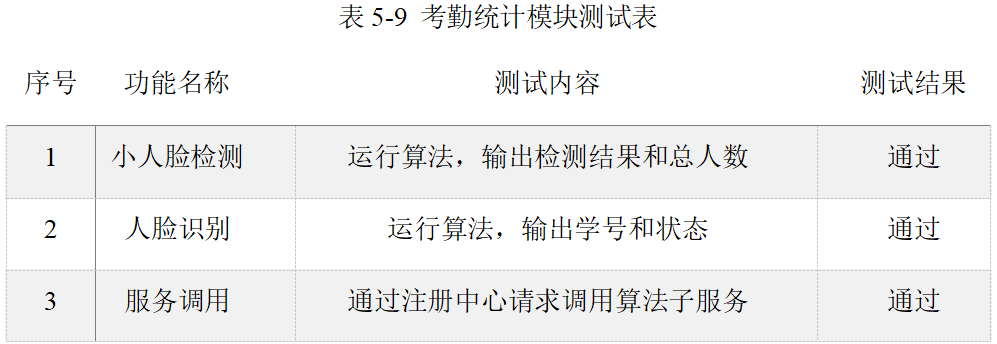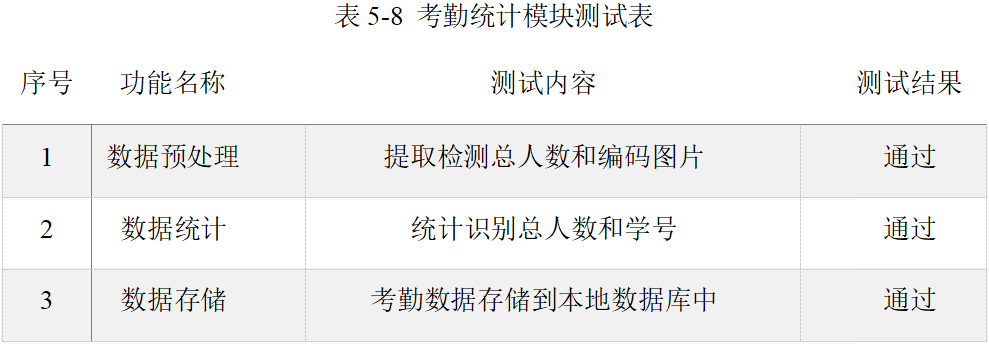 这个模块主要涉及数据预处理、统计以及数据库存储。系统后端得到 JSON 格式的数据,通过预处理 Map 格式数据提取学号等有效信息。用字符串数组来存放非重复学号,统计识别的总人数,并与检测总人数比对,根据签到时间、学号、课程号等参数把识别结果记录到数据库中。对部分功能测试,内容见表 5-8。